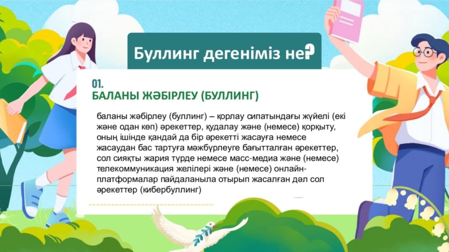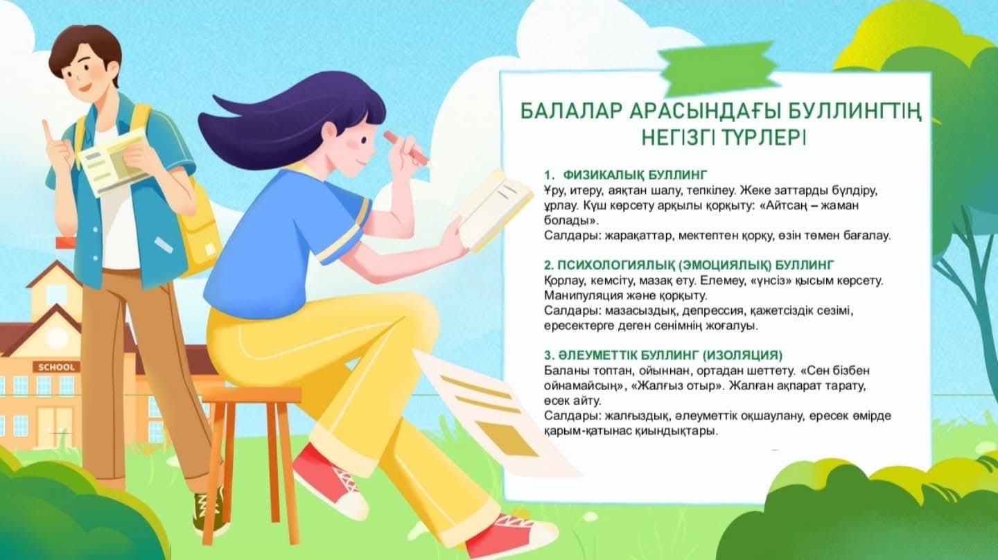 Мақсаты: Жасөспірім кезеңіндегі кездесетін буллингтің түрлерін, себептерін анықтау және алдын алу. Мектеп психологы слайдтар мен бейнебаяндар көрсетті. Бала тәрбиесі ортақ міндет болатыны жайында маңызды ақпараттар беру. Барлығымыз бірлесе жұмыс атқарғанда ғана, жақсы нәтижелер мен жетістіктерге қол жеткіземіз. Сіздермен бірлесе отырып бала тәрбиесіне байланысты мәселелерге көңіл аударуға, оны шешуге, бала жүрегіне жол табуға, түсінуге тырысу керектігі туралы ақпарат берілді.