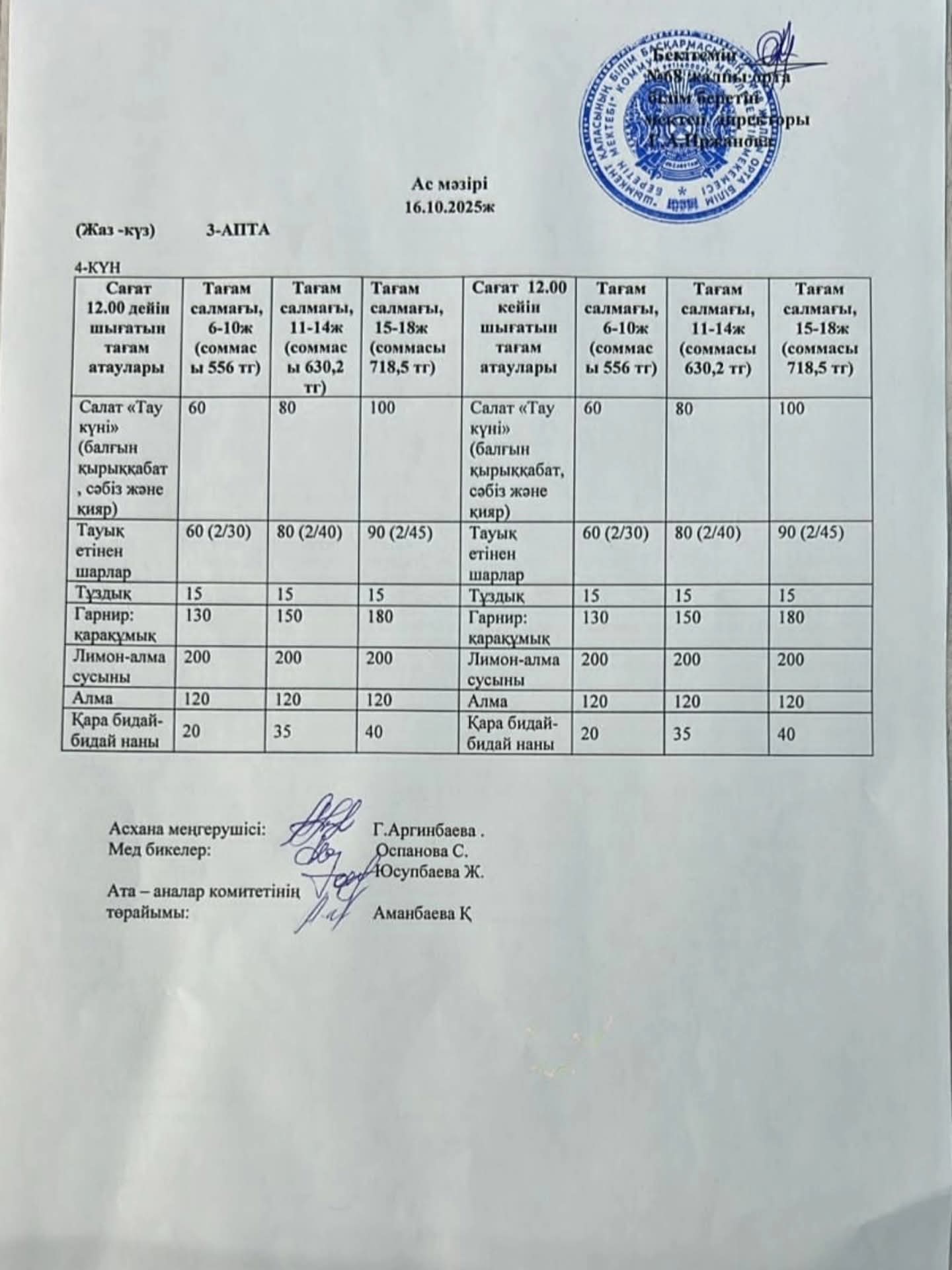 №68 жалпы орта білім беретін мектебі » Ақпарат » Шымкент қаласы білім басқармасына қарасты №68 жалпы орта білім беретін мектебінің 16.10.2025ж оқушыларға арналған бір күндік ас мәзірі.