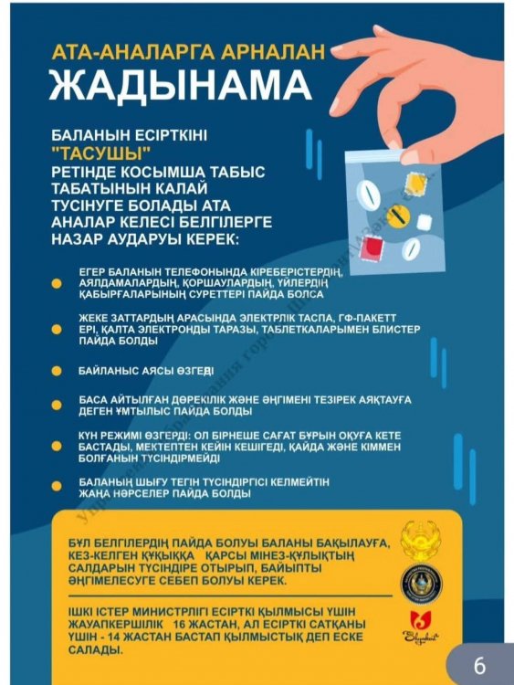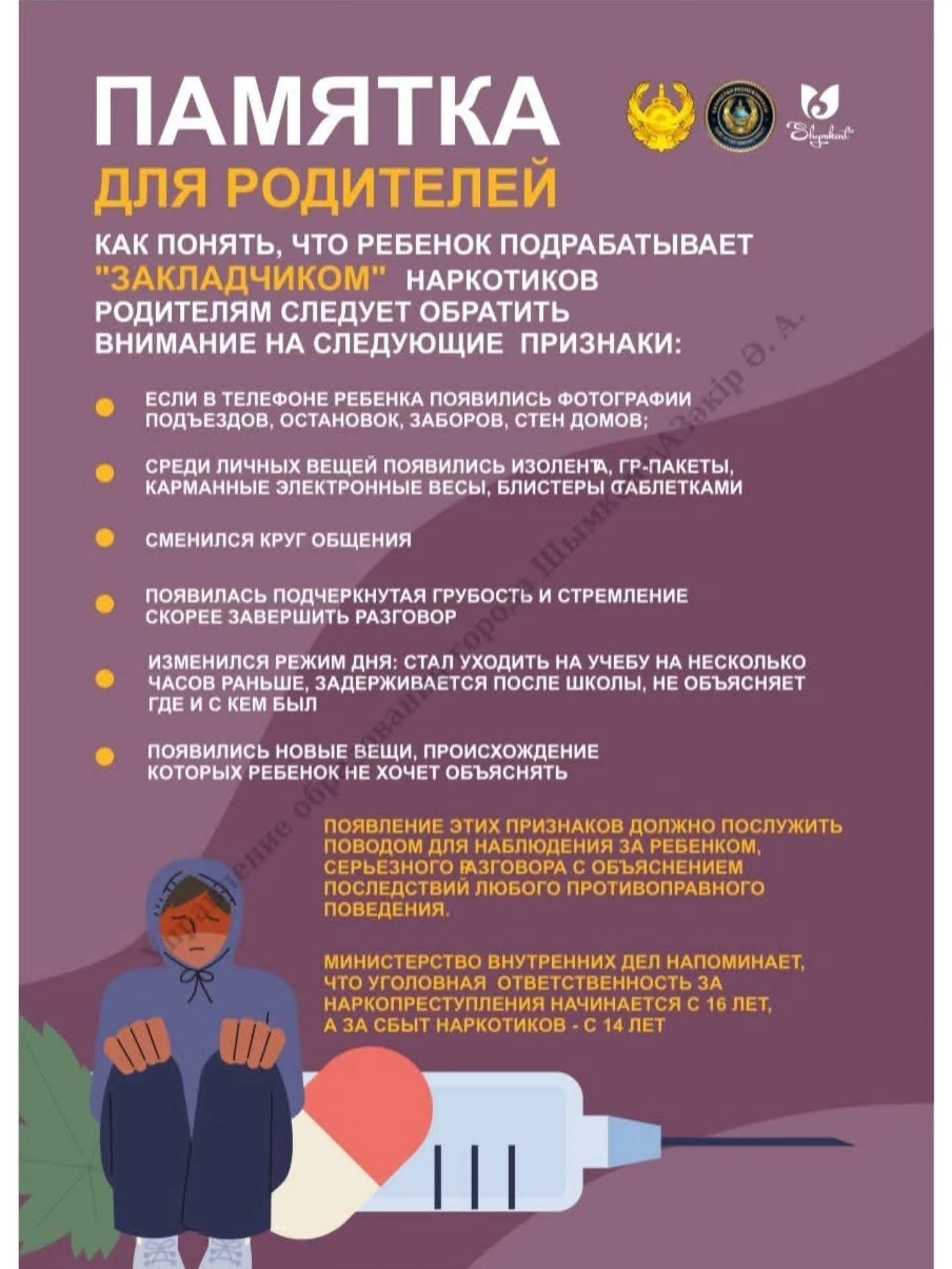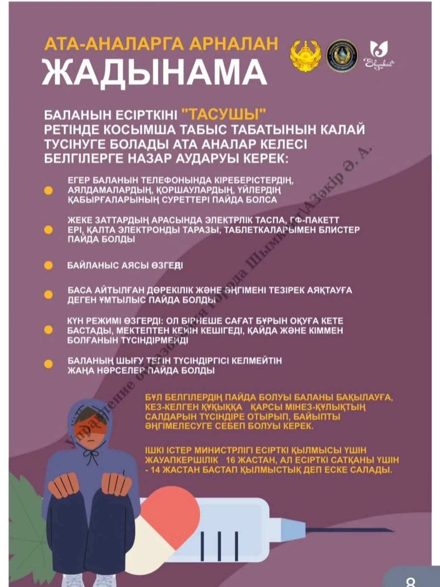 Бұл материалдардың 🎯 мақсаты – балалар мен жасөспірімдерді зиянды әдеттерден қорғау, нашақорлықтың ⚠️ салдары туралы дұрыс ақпарат беру, ата-ана мен бала арасындағы 🤝 сенімді қарым-қатынасты нығайту және қауіптің алдын алуда ⏰ дер кезінде әрекет етуге көмектесу.