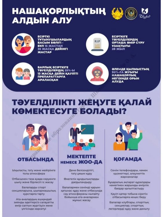 Инфографикаларда тәуелділіктің 🚫 белгілері, оның 🩺 денсаулық пен 🌱 болашаққа әсері, сондай-ақ алдын алу жолдары 📌 қарапайым әрі түсінікті түрде көрсетілген.